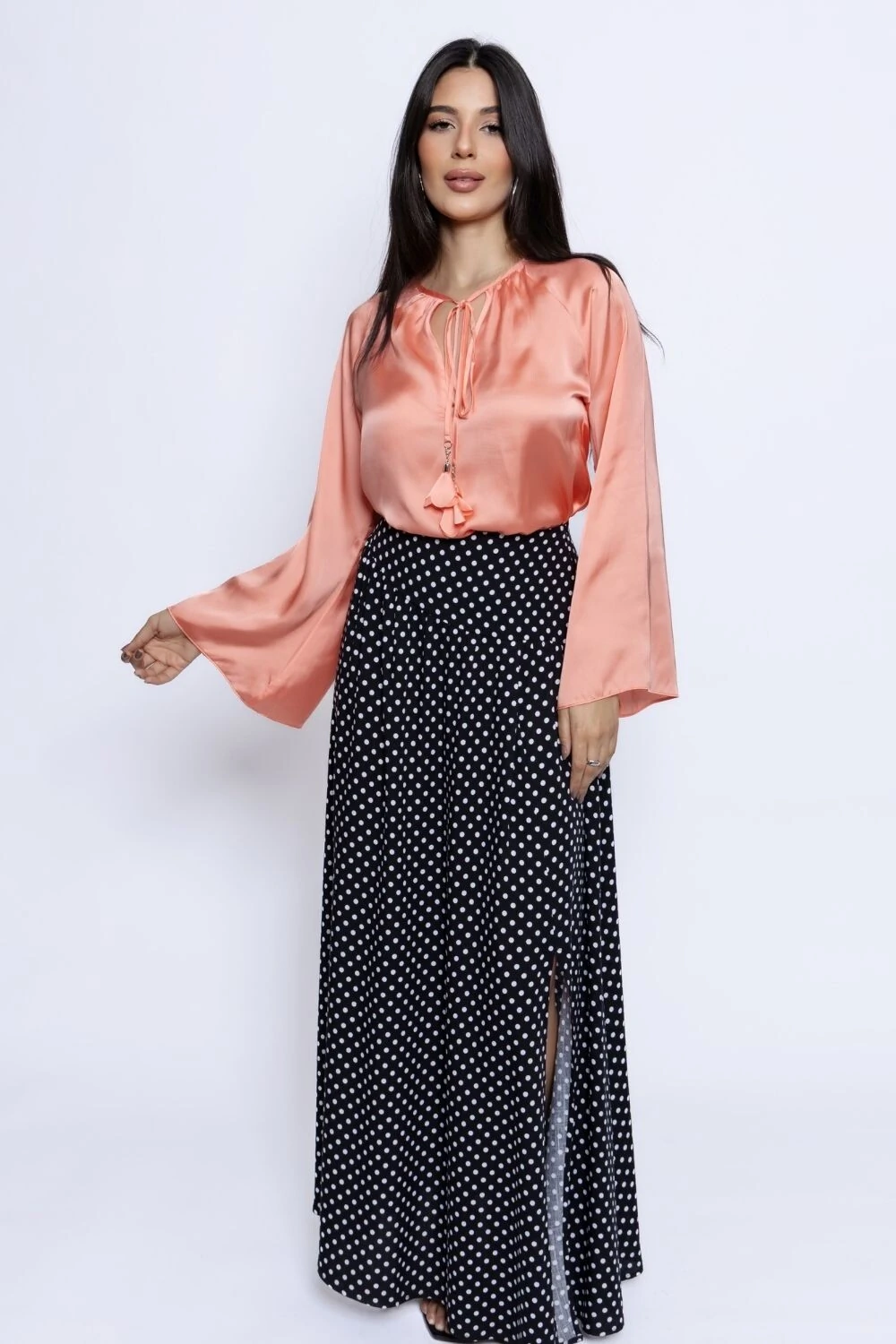 Confeccionada em glow satin, mangas compridas e detalhe de recorte no decote com pingente.
