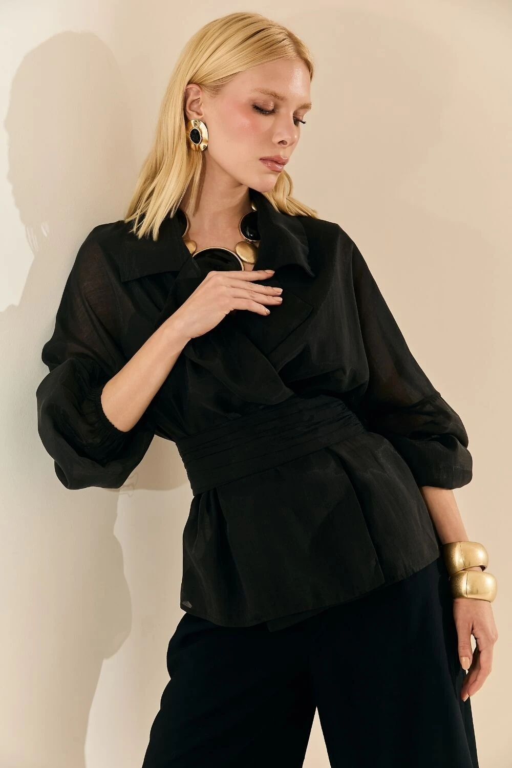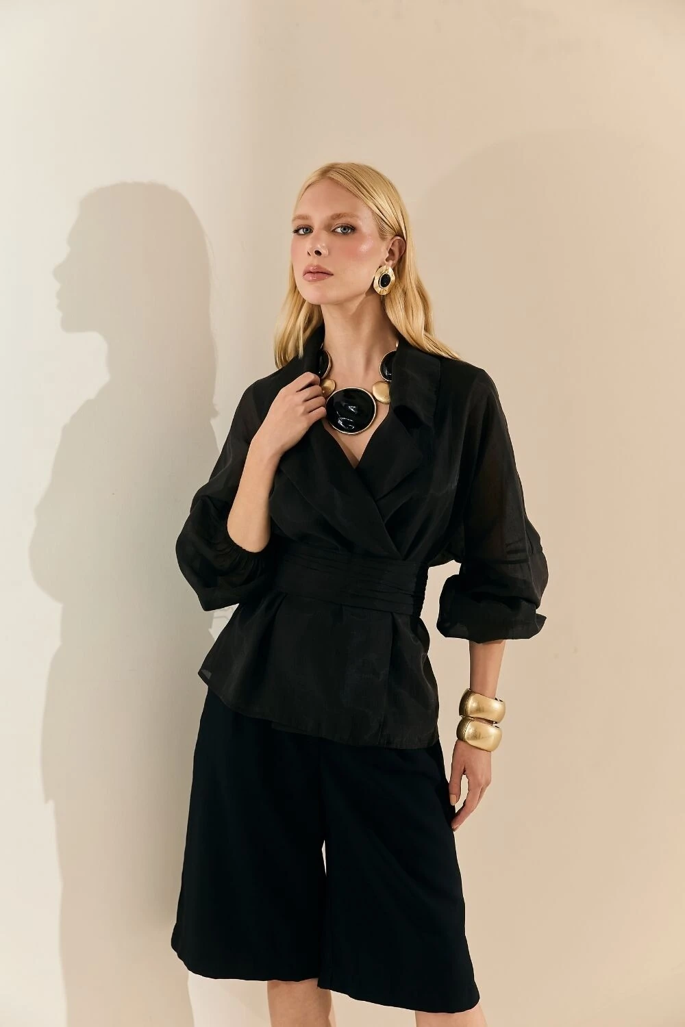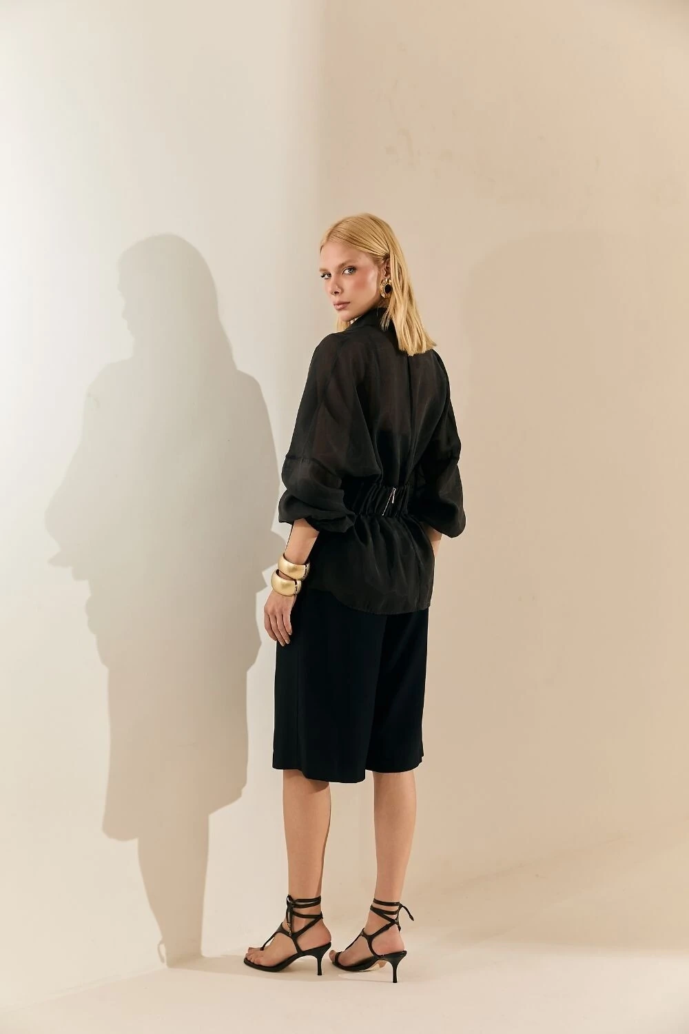 Bermuda com pregas de corte alfaiataria. Possui cós com passantes, bolso faca frontal, bolso traseiro embutido, elástico traseiro e fechamento em colchete e zíper.
