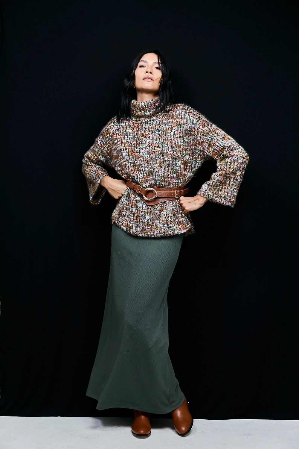 Blusa confeccionada em um blend têxtil de alta qualidade. Seu caimento oversized oferece um volume elegante e fluido, enquanto os ombros descolados reforçam a proposta comfy-chic. O diferencial está na gola alta estruturada, que confere um ar intelectual e sofisticado à peça, ideal para os dias de temperaturas amenas. As fendas laterais de ambos os lados não são apenas um detalhe estético; elas proporcionam um movimento harmônico ao caminhar e permitem diferentes formas de uso — seja solta sobre a calça ou levemente colocada para dentro para marcar a silhueta.