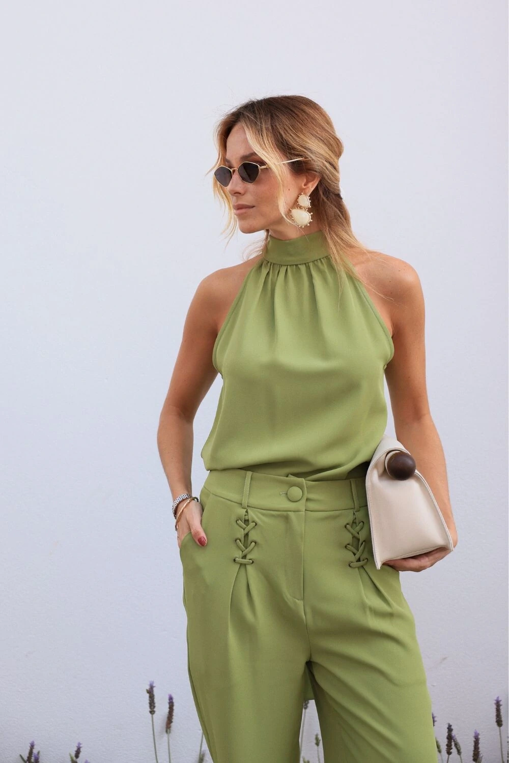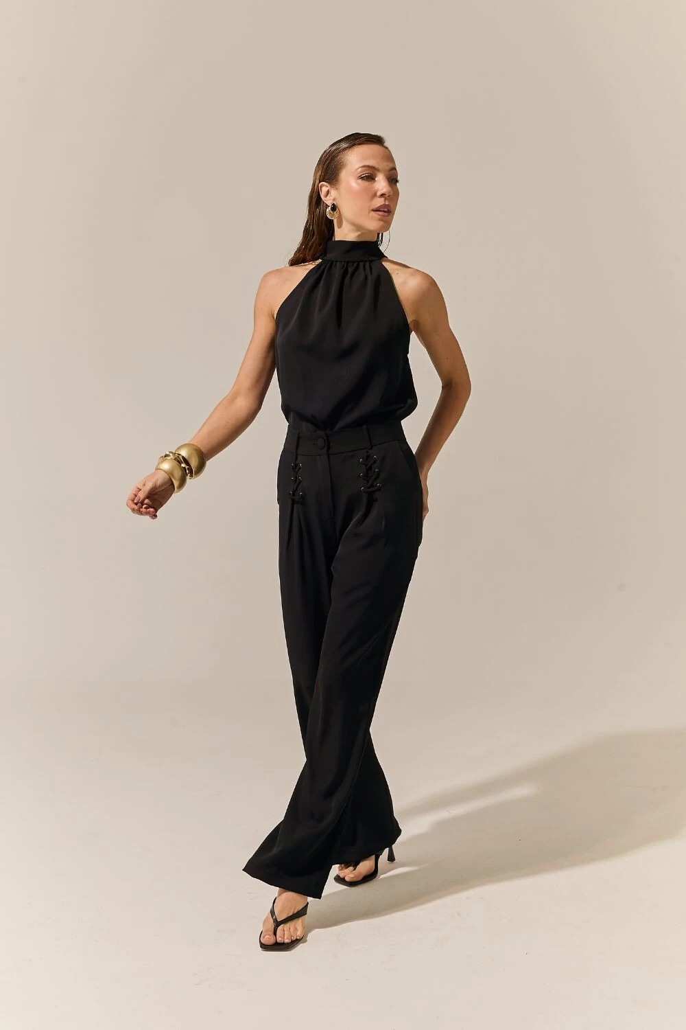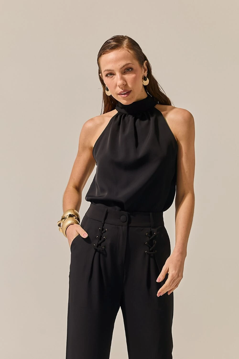 Destaque-se com a Blusa Halter com Laço, feita em crepe leve e fluido, perfeita para compor looks modernos e femininos. O modelo halter valoriza os ombros e o colo, enquanto o laço delicado na gola traz um toque de charme e sofisticação.