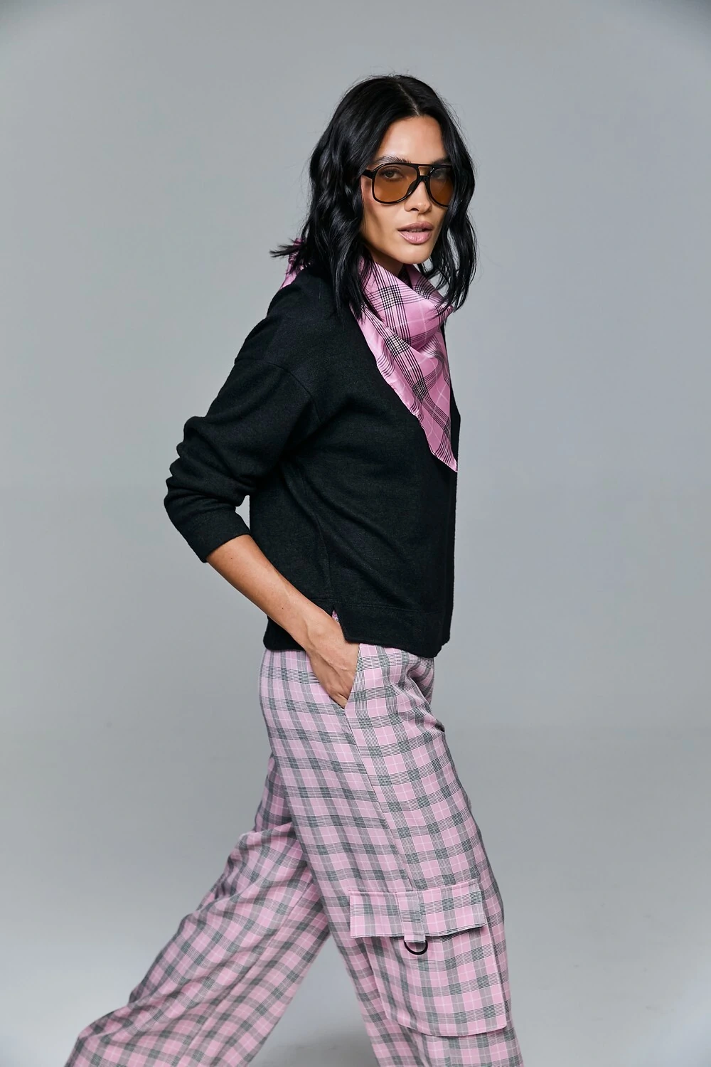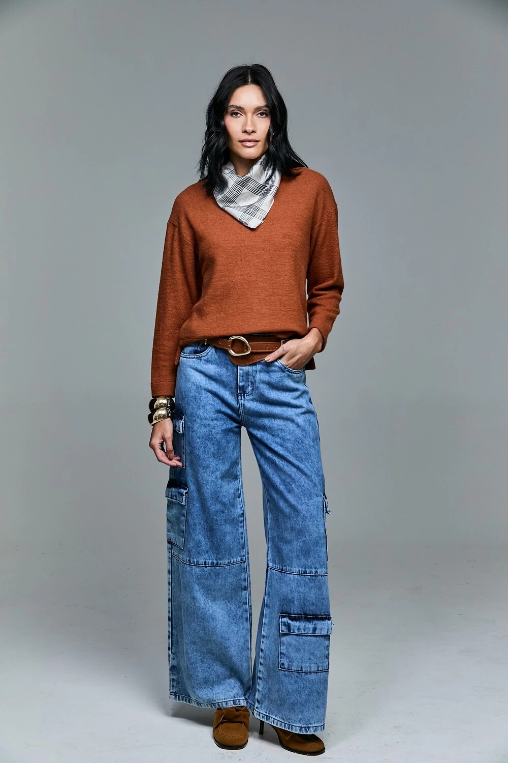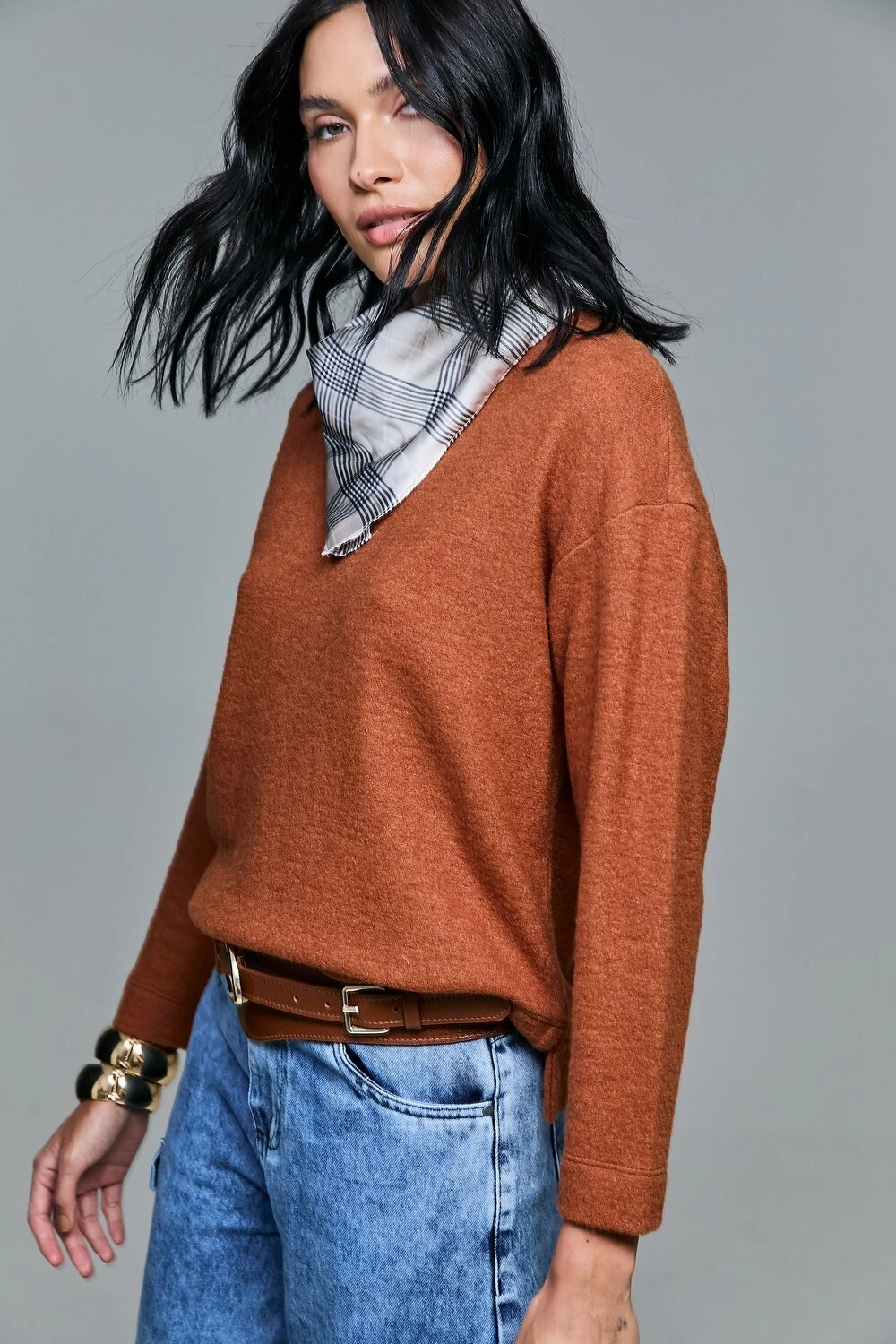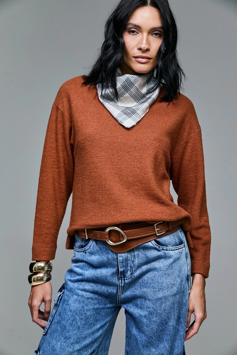 A blusa manga longa é a definição de uma peça inteligente e estilosa para o inverno. Confeccionada em uma malha de lã leve, ela oferece o equilíbrio perfeito: mantém a temperatura do corpo sem adicionar volume excessivo, permitindo um caimento fluido e elegante. O grande diferencial desta peça é a bandana avulsa, que abre um leque de possibilidades. Você pode usá-la amarrada ao pescoço para um visual retrô e sofisticado, como faixa de cabelo para um toque moderno, ou até mesmo removê-la para um look minimalista e clean. É o acessório perfeito que já vem pronto para elevar a sua produção. Com punhos ajustados e uma modelagem que abraça o corpo com suavidade, esta blusa é ideal para ser a base de looks com camadas ou a protagonista de um visual de meia-estação.
