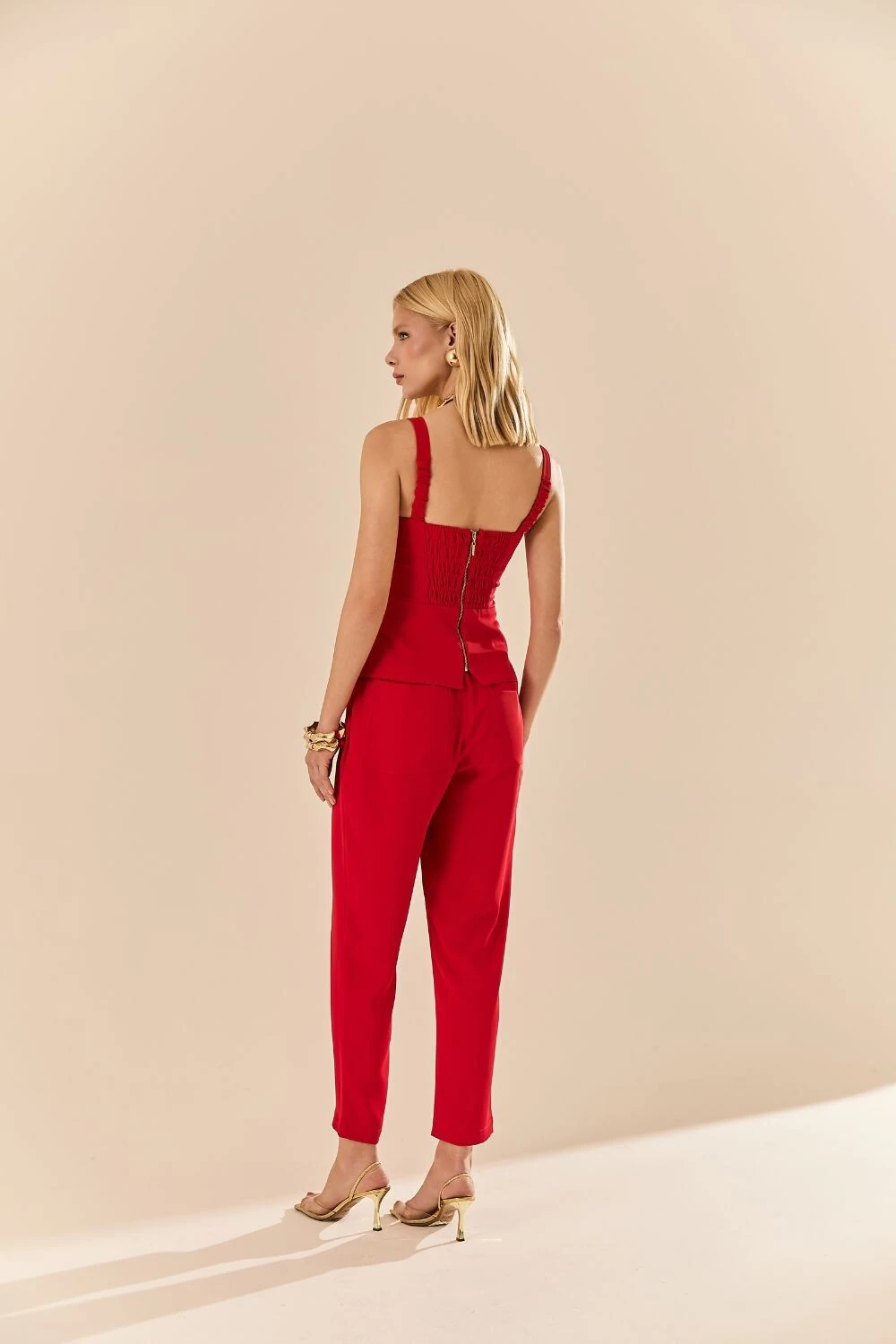 Calça slim com bolsos faca frontais, bolsos traseiros quadrados, ajuste elástico na parte traseira da cintura, comprimento no tornozelo e fechamento em zíper e colchete.
