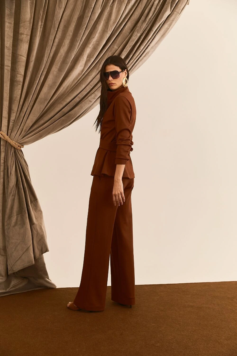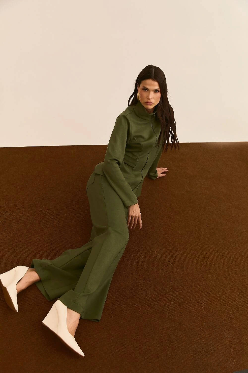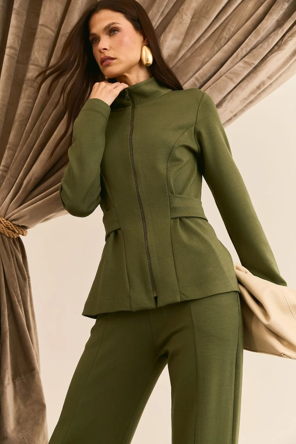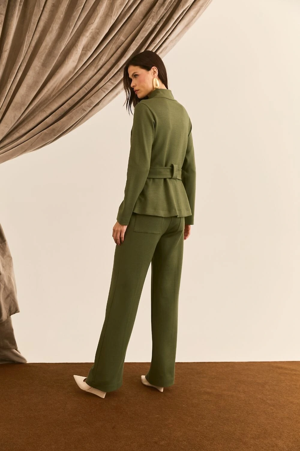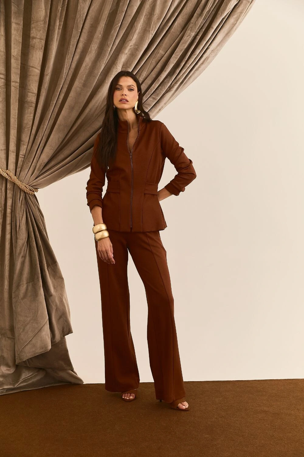 Calça com recorte frontal, bolsos faca, bolsos traseiros, caimento reto ao corpo.