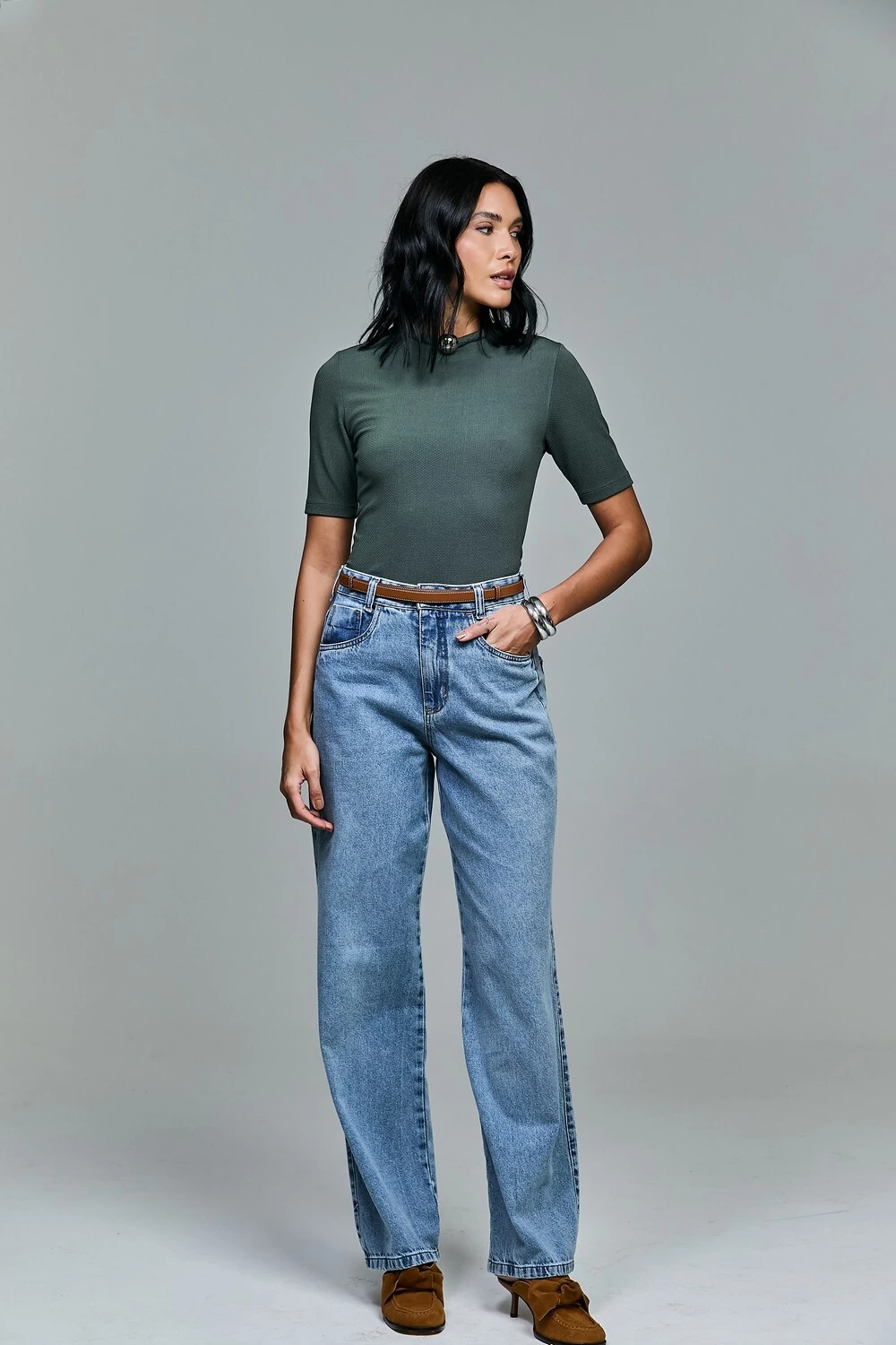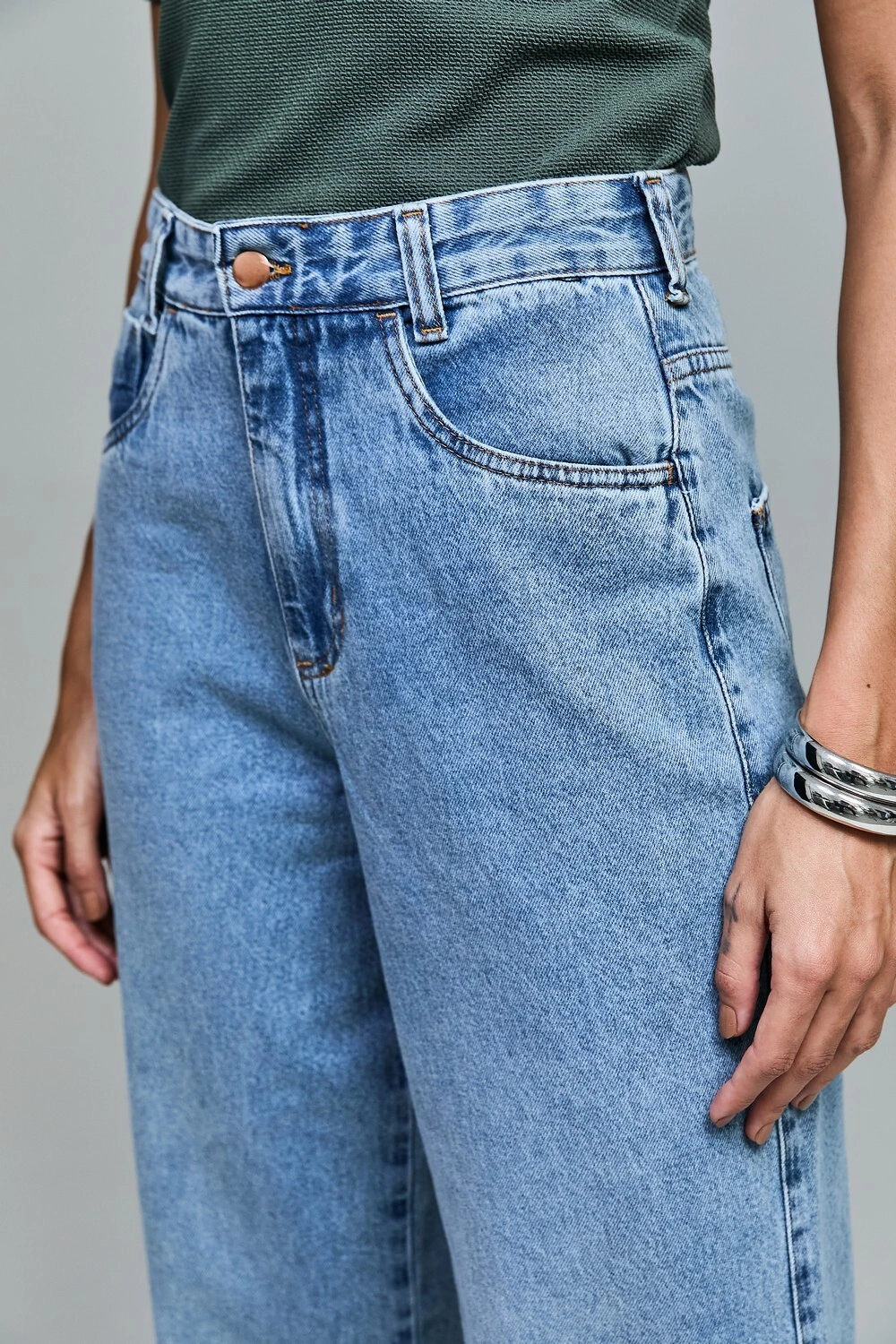 A calça jeans wide leg é a peça fundamental para quem busca unir conforto e informação de moda em um único item. Com uma lavagem clara que evoca um ar solar e despojado, este jeans é a tradução do "cool" contemporâneo. Sua modelagem wide leg oferece um caimento solto e fluido, que não apenas proporciona conforto absoluto durante todo o dia, mas também cria uma silhueta alongada e imponente. A cintura alta valoriza a postura e permite combinações versáteis, indo do visual mais casual ao mais sofisticado com facilidade.