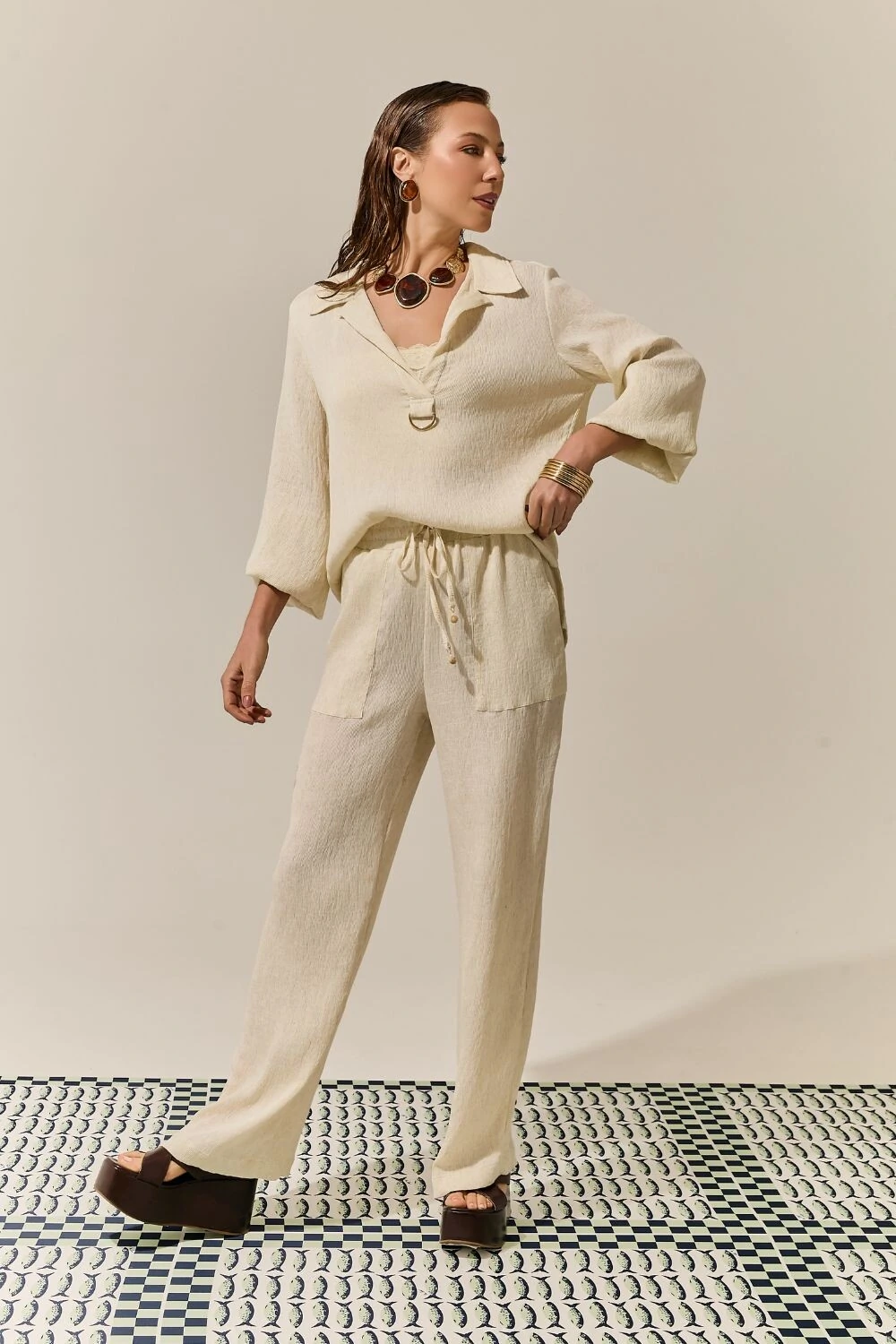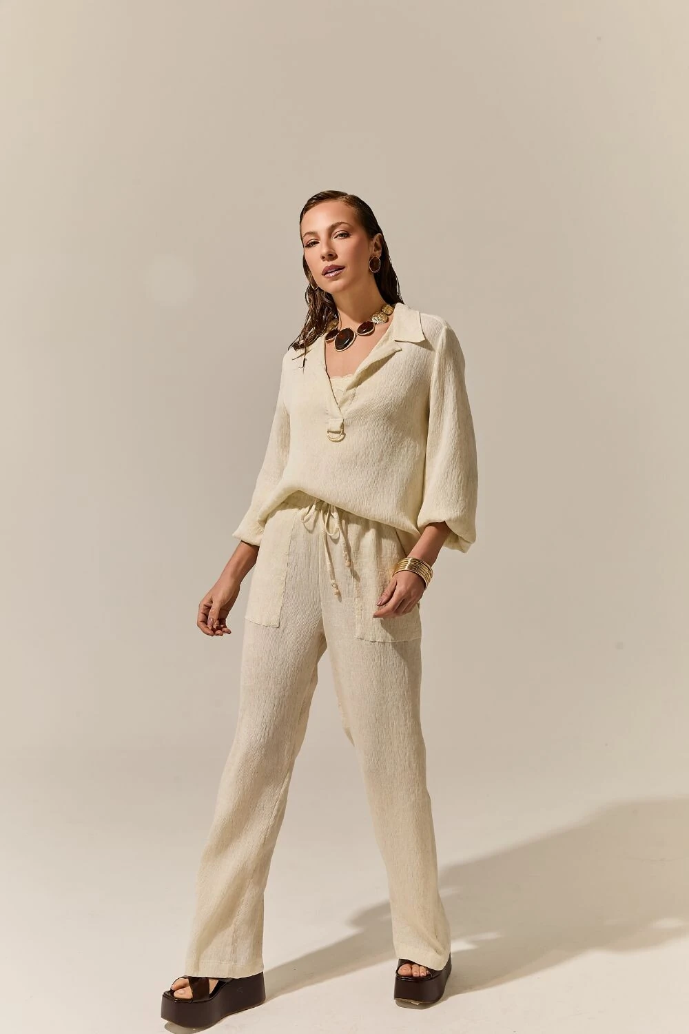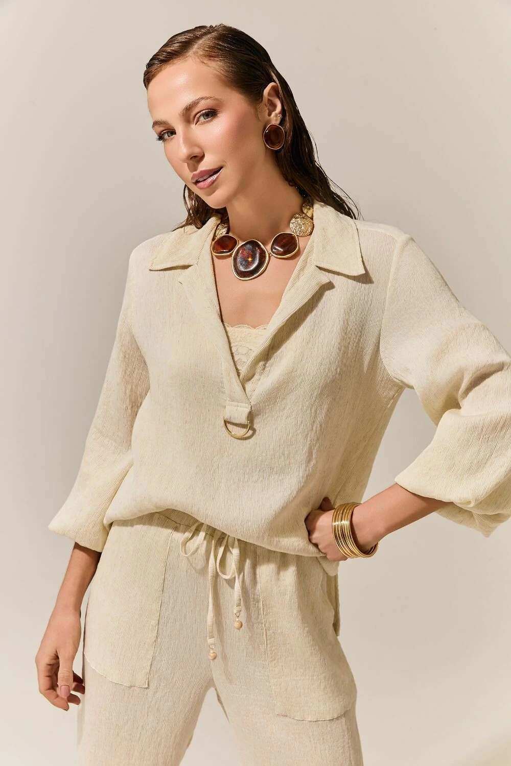 Com mangas longas, detalhe frontal e acabamento premium, essa peça combina perfeitamente com calças de alfaiataria, jeans ou shorts.