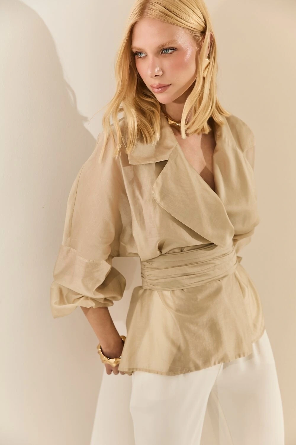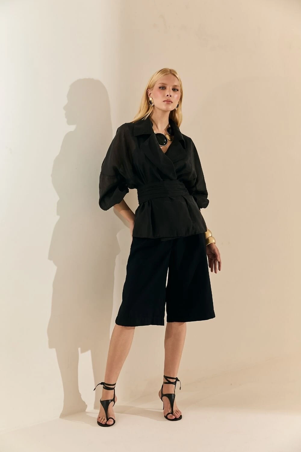 Camisa de organza transpassada com amarração e elástico nas mangas.
