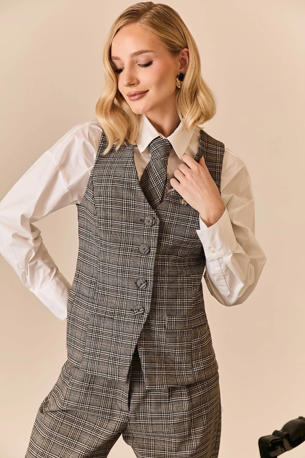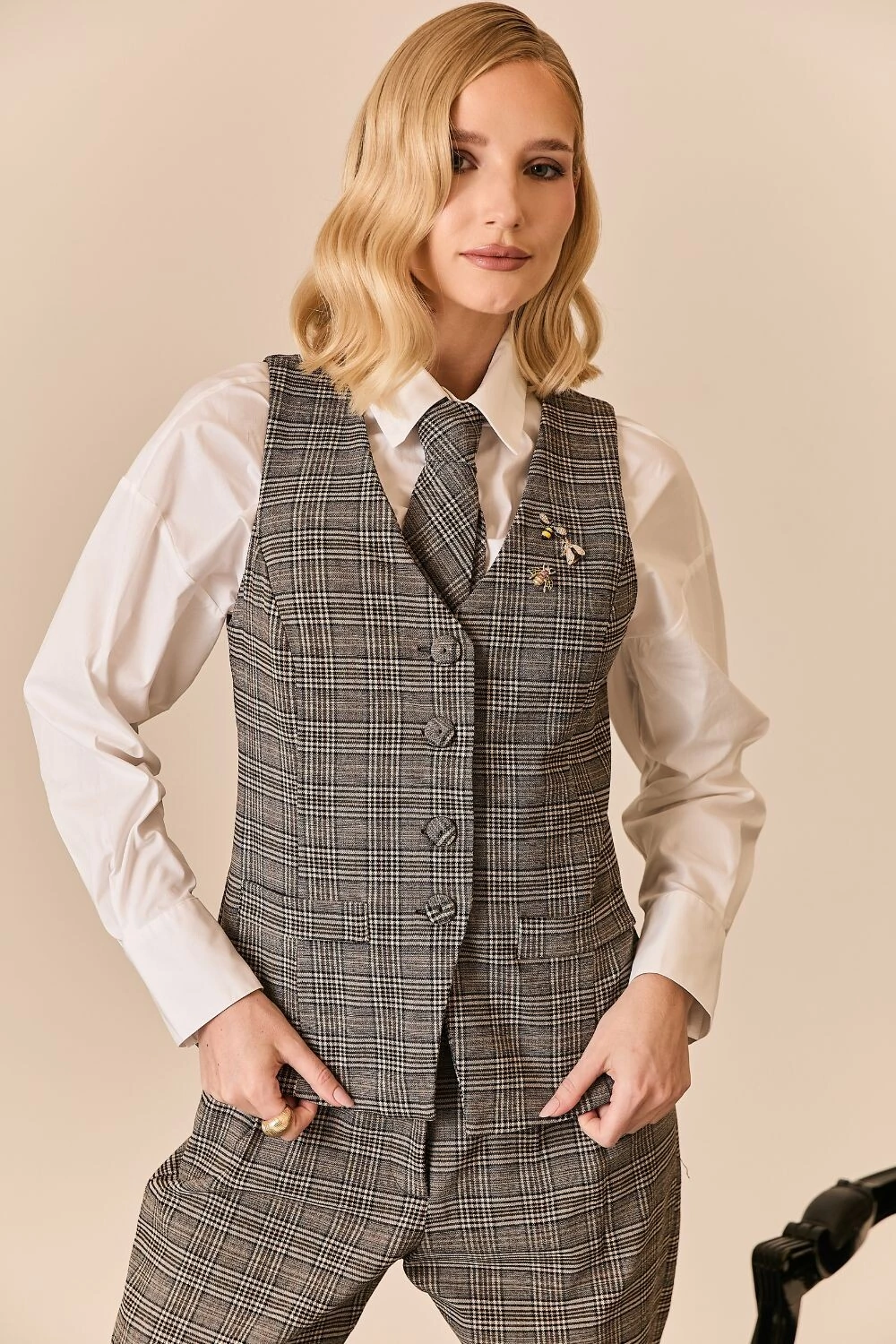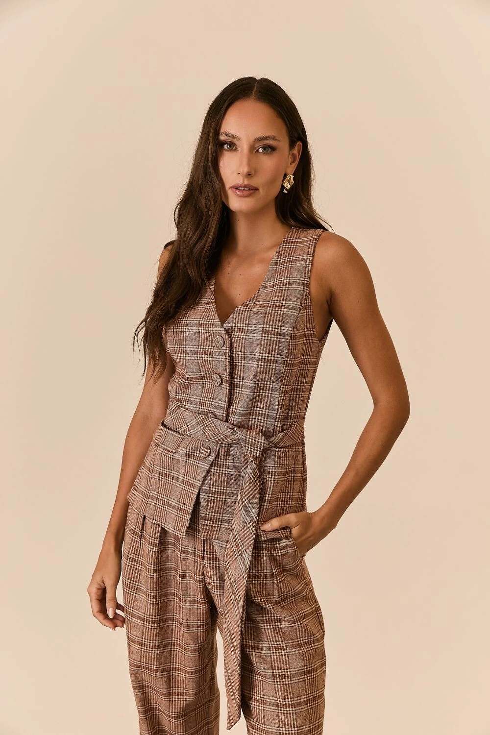 O colete xadrez apresenta uma proposta atual da alfaiataria clássica, com padronagem xadrez que traz um toque sofisticado ao look. Confeccionado em tecido de alfaiataria, conta com modelagem regular e comprimento alongado, garantindo um caimento elegante e estruturado. O decote em V, o fechamento frontal por botões e os bolsos funcionais destacam seu estilo refinado, tornando a peça perfeita para produções versáteis, seja usada como sobreposição ou como protagonista da composição.