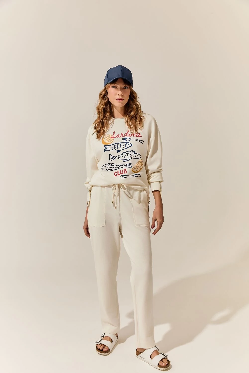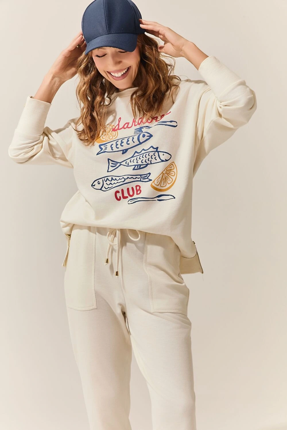Leve o bom humor e o conforto para o seu dia a dia com o nosso conjunto Sardines Club. Feito em malha leve e macia, ele é perfeito para momentos de relaxamento, mas com um toque de personalidade. A blusa tem estampa divertida com ilustração de sardinhas, limões e talheres, dando um ar descontraído e original ao look. A calça, com cós elástico e bolsos laterais, complementa o visual com praticidade e estilo.