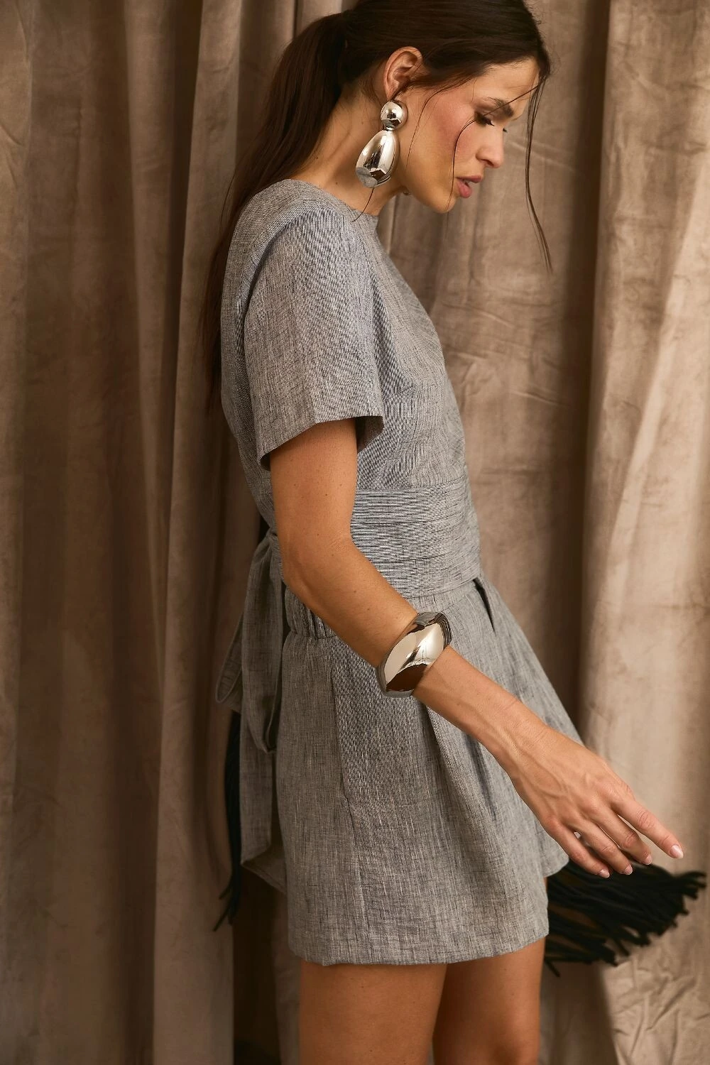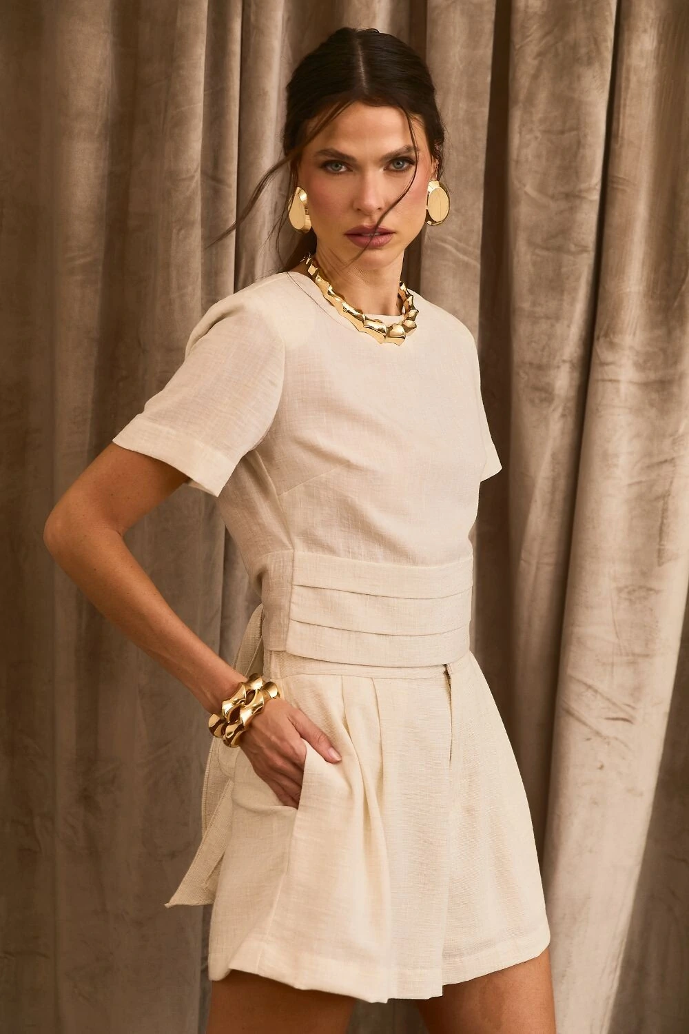 Shorts curto forrado, caimento reto ao corpo, pregas frontais, bolso invisível nas laterais, elástico nas laterais traseira do cós para melhor ajuste na cintura e fechamento em zíper e colchete.