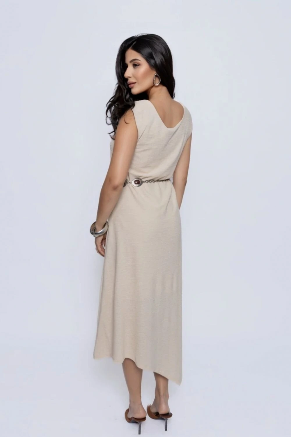 Este vestido é perfeito para diversas ocasiões. Você pode combiná-lo com acessórios mais sofisticados para um look de festa ou usar de maneira mais casual com tênis ou sandálias para um visual descomplicado e moderno. A tonalidade neutra e o design minimalista tornam-no fácil de combinar com diferentes estilos de acessórios, bolsas e calçados.