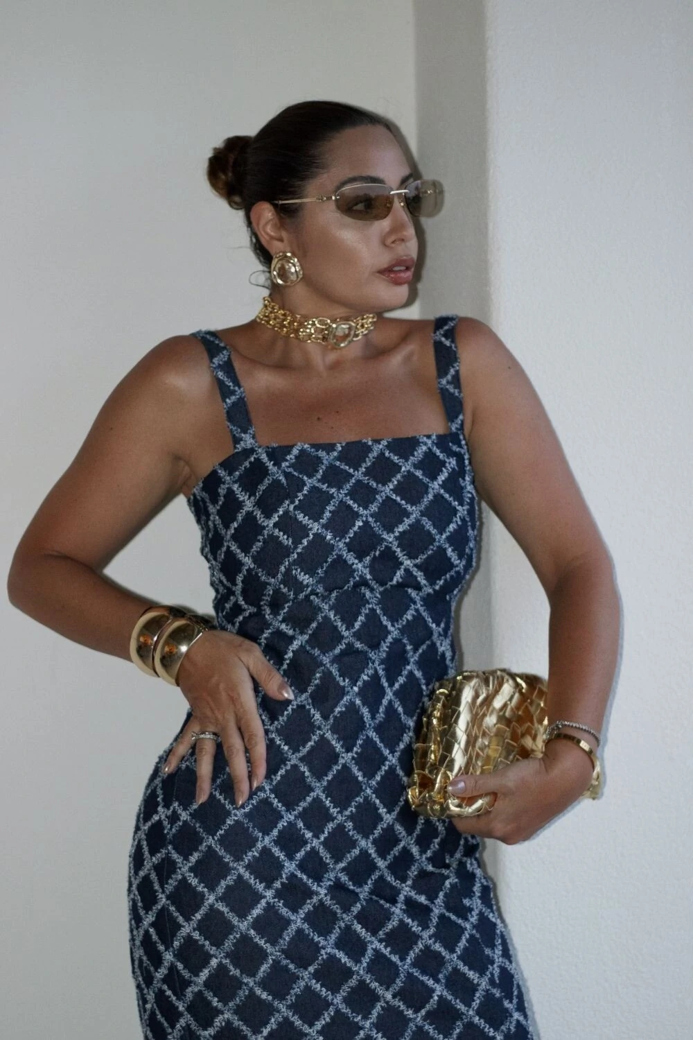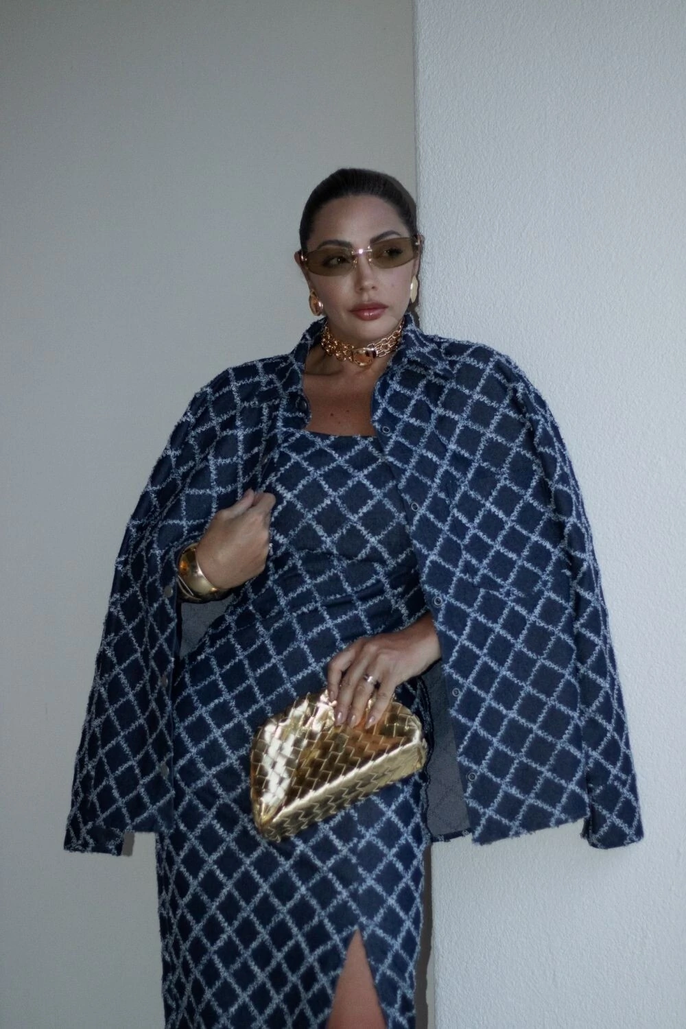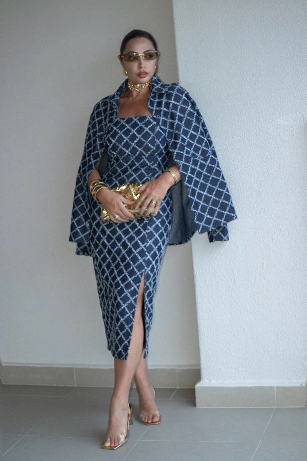 Vestido midi bordado estruturado com recorte no busto, fenda, caimento ajustado ao corpo e fechamento em zíper destacável nas costas.