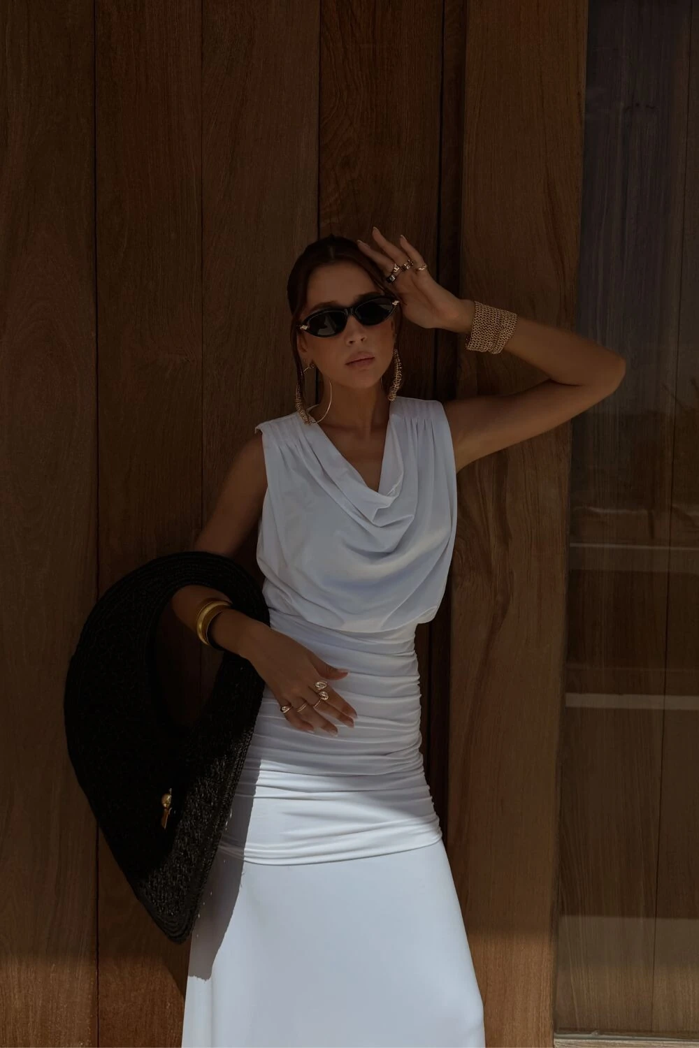 Vestido drapeado com ombreiras, acompanha saia removível com fenda.
