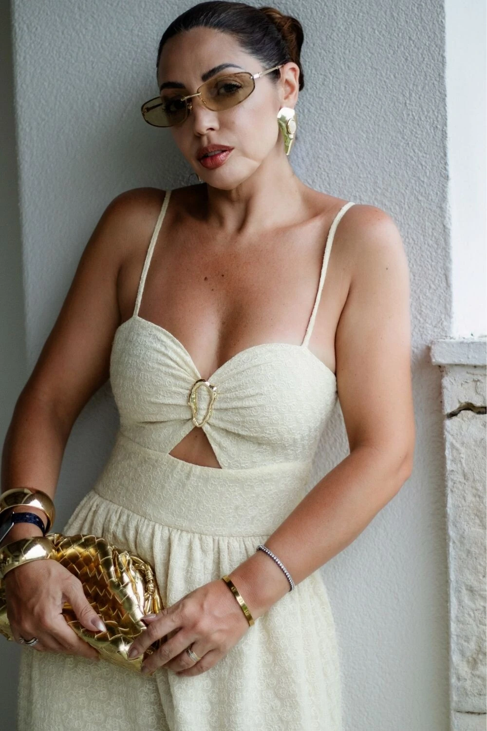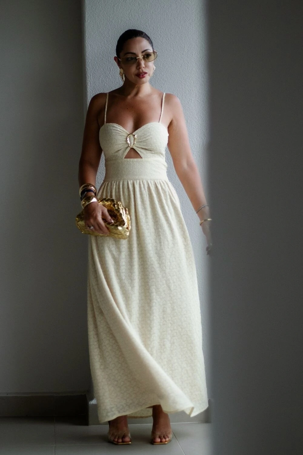 Vestido confeccionado em tecido leve, com modelagem ajustada ao corpo, alças finas e detalhe de fivela no busto. Possui fechamento posterior por zíper e comprimento longo. Perfeito para um look casual.
