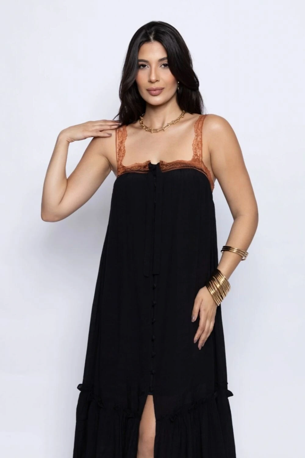 O vestido proporciona um caimento impecável, realçando as curvas com sutileza e garantindo conforto ao vestir. O acabamento delicado e os detalhes em renda conferem um ar romântico e sofisticado, enquanto as alças finas oferecem sustentação com leveza, valorizando o colo e os ombros de forma elegante. Seu design fluido e alongado traz movimento e leveza à silhueta, criando um visual imponente e feminino.